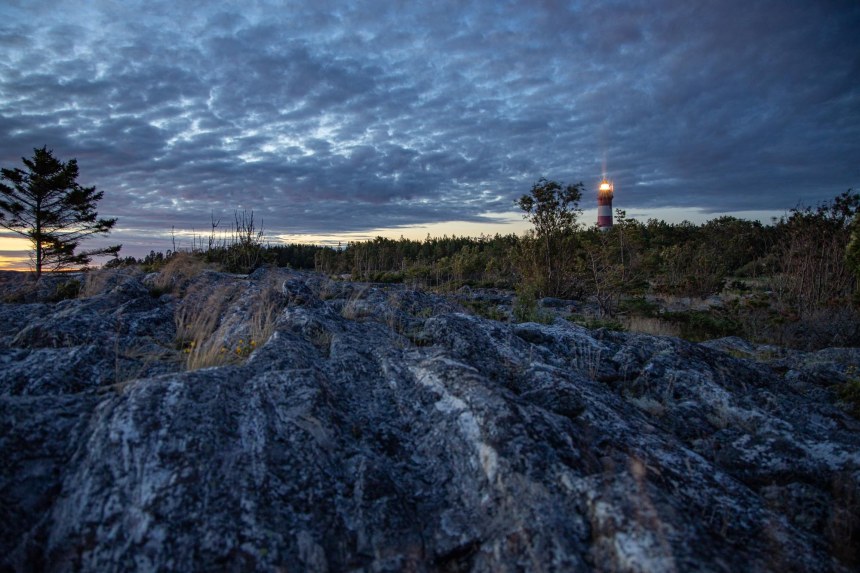 Kun majakanvartijan tärkein tehtävä on hoidettu ja tornissa tuikkii valo, voi taas lähteä kiertelemään rannan kallioita. Pimenevää iltaa tarkkailee parhaiten saaren eteläkärjen kallioilta. Ne tuntuvat vain jatkuvan ja jatkuvan kohti etelää.