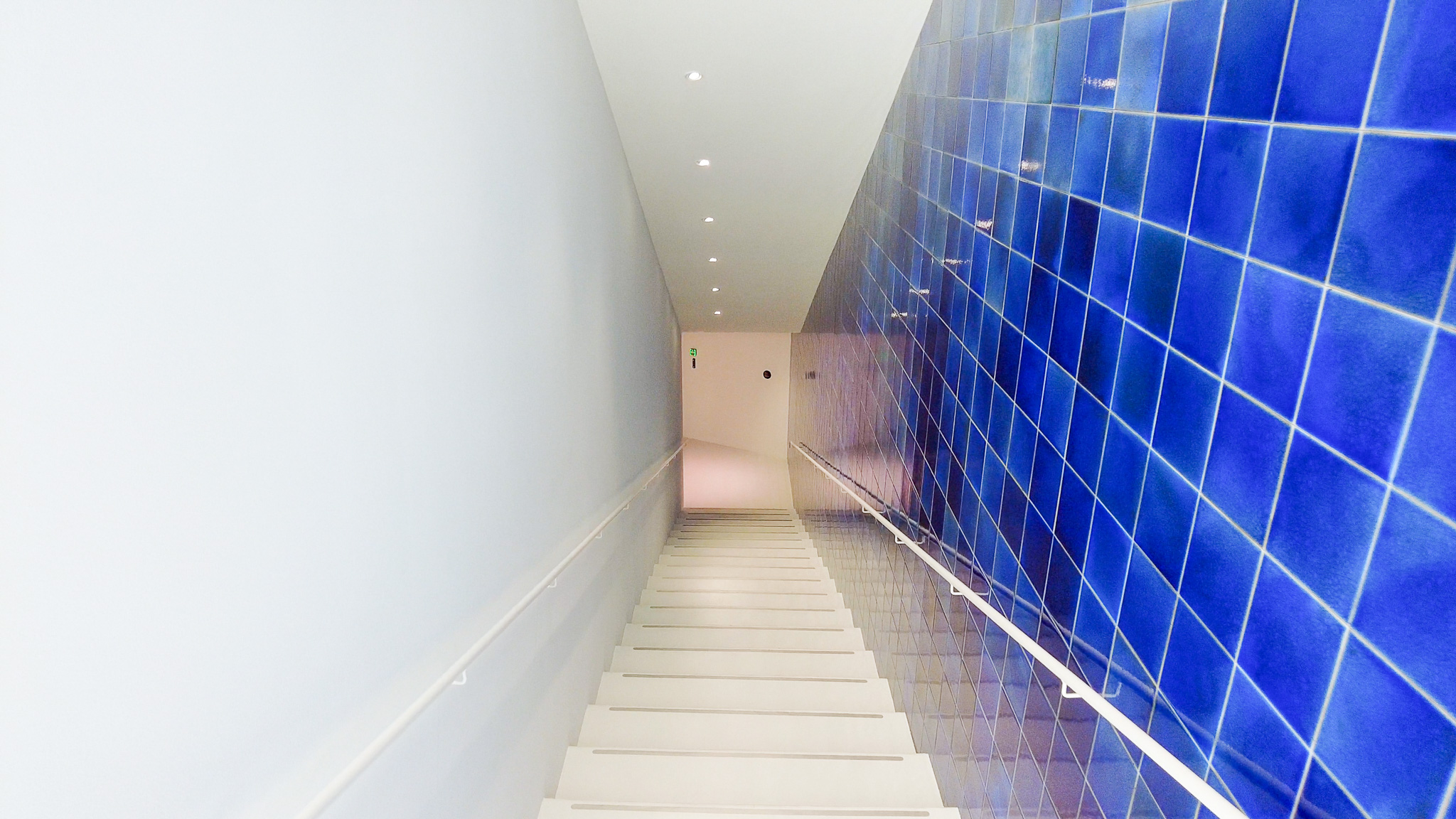 Sisällä ihmisen kokoiset tilat ja kapeiden käytävien kautta tapahtuvat siirtymät tuovat Chappeen modernin kotimuseon tunnelmaa. 1200-neliöisessä talossa pieni ja suuri vuorottelevat. Erityisesti tämän huomaa ylimpään kerrokseen johtavassa kapeassa portaikossa, jonka jälkeen näyttelytila avautuu nurkan takaa. Portaikossa merestä muistuttaa Karin Widnäsin syvänsininen keramiikkaseinä.